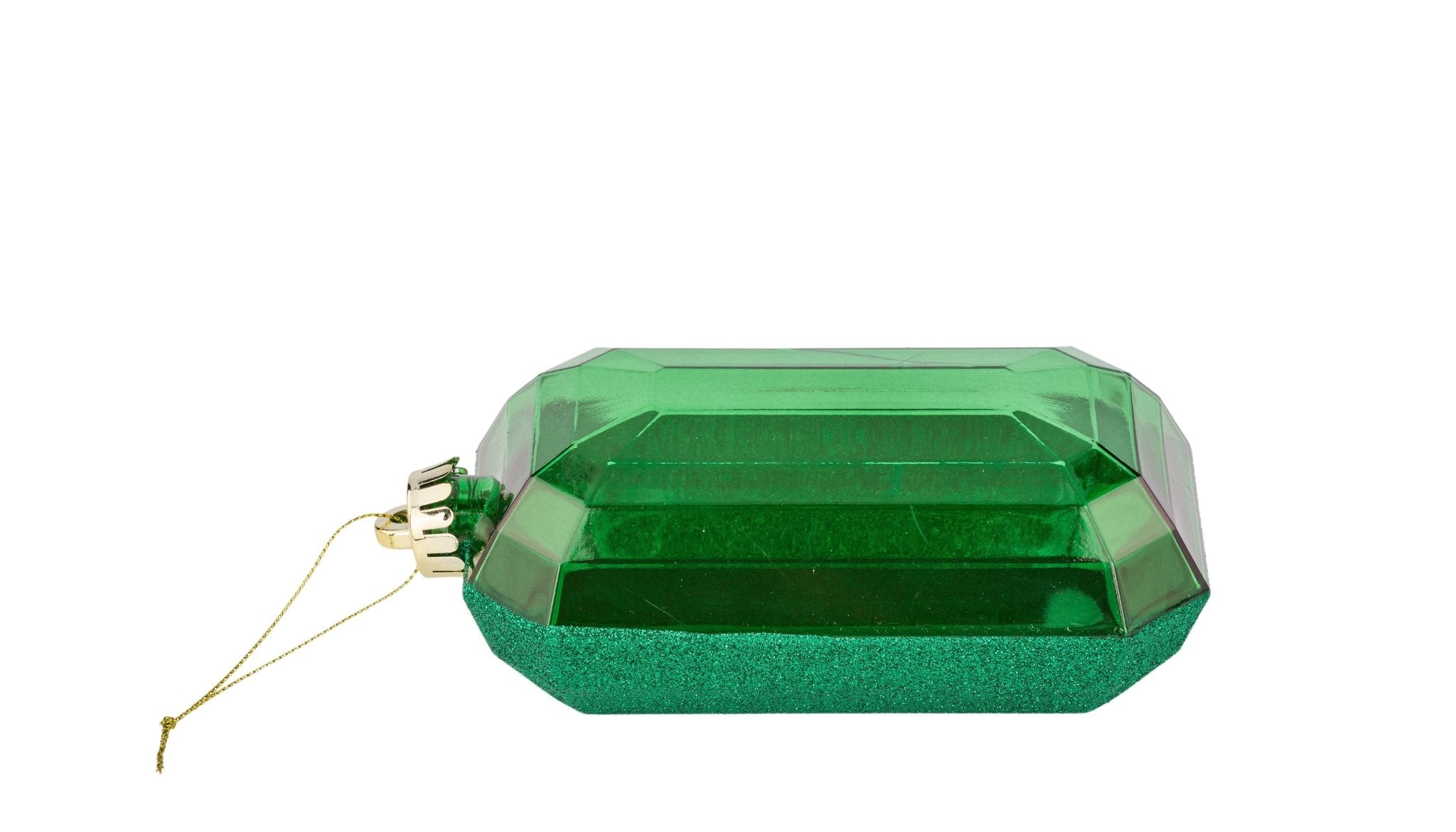 7" x 4" Emerald Green rectangular shaped gem ornament with gold glitter backing. Get that WOW factor from your tree or wreath with these over the top shatterproof precious gem ornaments!