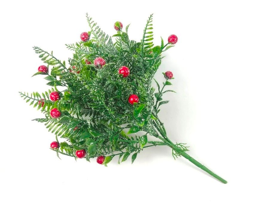 14" Snowy mixed leaf Spray with red berries. Great accent for Christmas trees, decor and florals, etc.