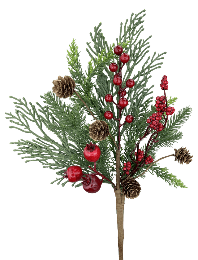 18" Pine Berry Mix pick with small and medium red berries and small pinecones. Perfect accent for Christmas decor and florals, etc.