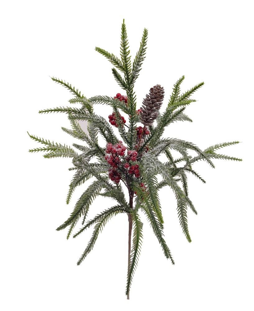 22" Iced Pine spray with snowy red berries and a pinecone.  Perfect for your winter and Christmas themed wreaths, trees, floral arrangements, and decor.
