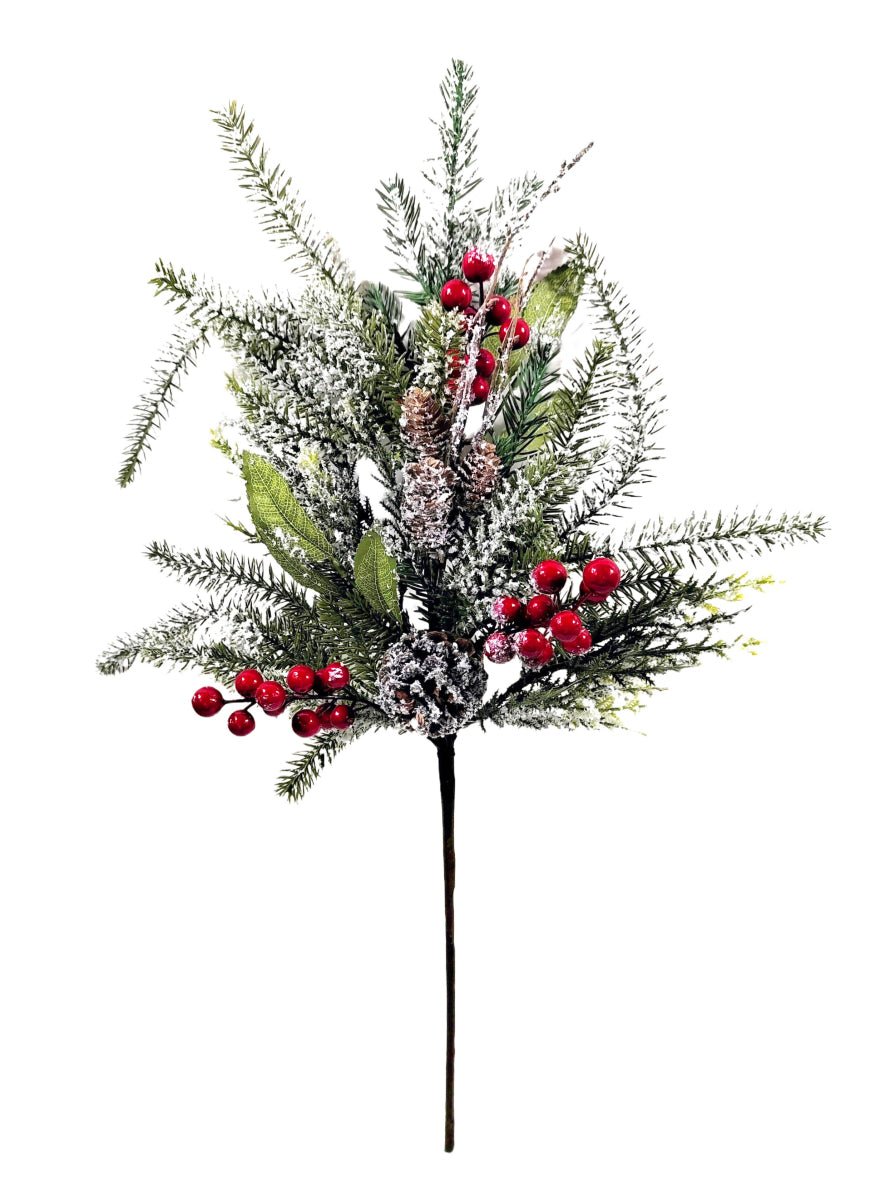 24" Snow frosted plastic pine spray with red berries and small pinecones. Perfect accent for snowy Christmas decor and florals, etc.
