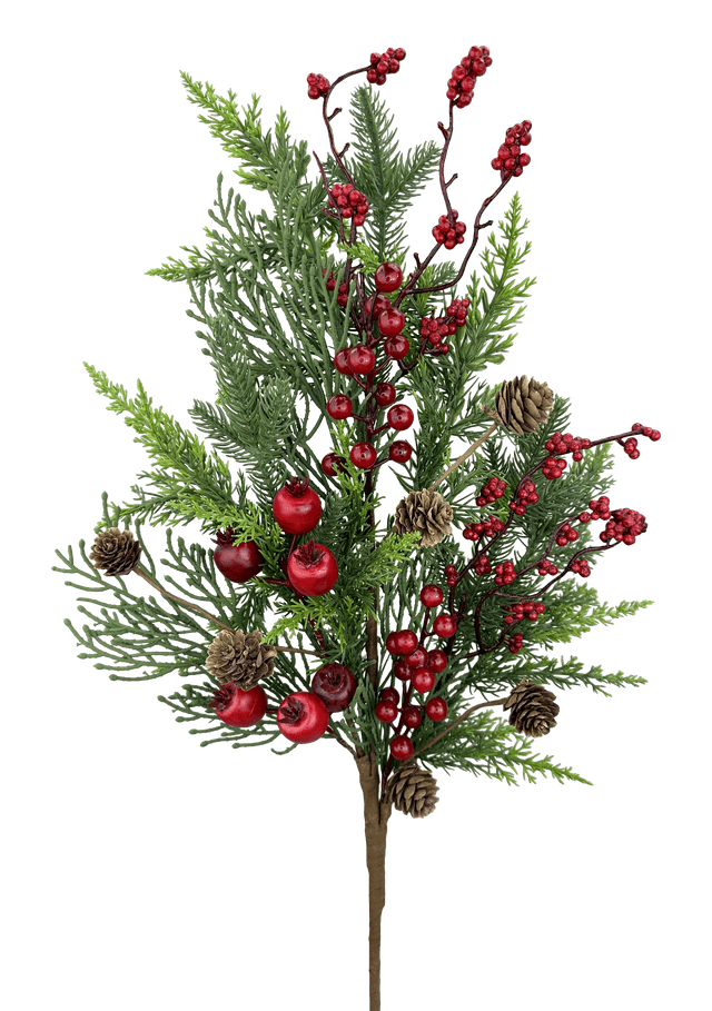 28" Pine Berry Mix spray with small and medium red berries and small pinecones. Perfect accent for Christmas decor and florals, etc.