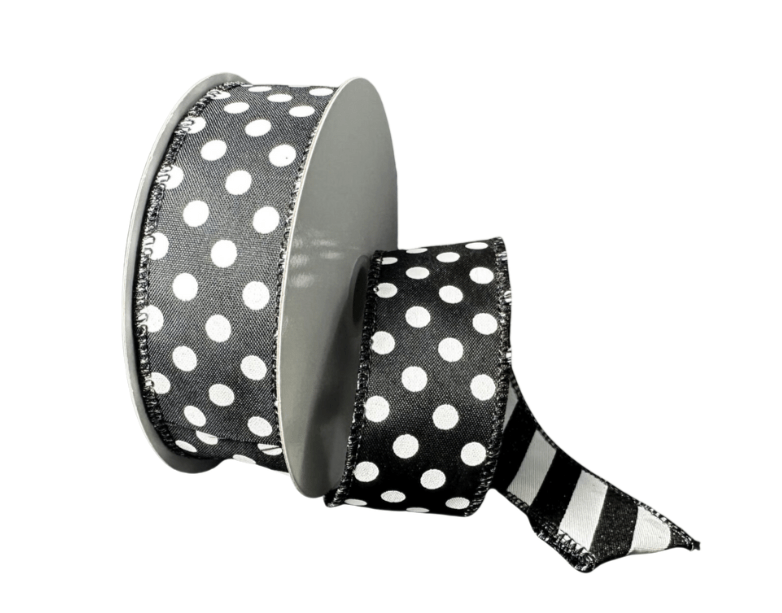1.5" Double sided ribbon. One side is satin black and white polka dot and reverse side is glittery black and white diagonal stripes. 10 yards, wired. Beautiful ribbon for when you need some black and white!
