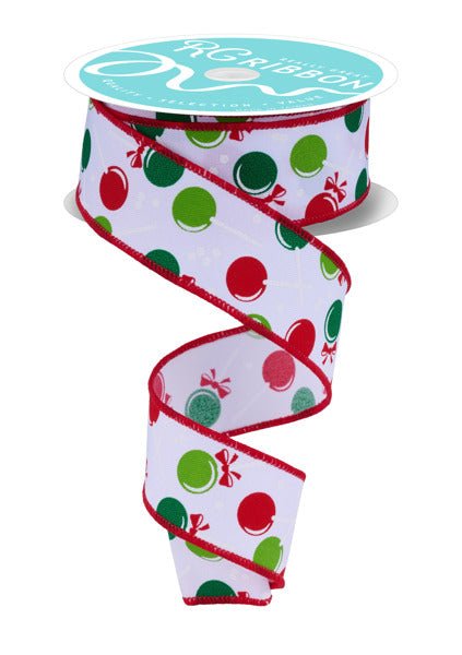 A 1.5 inch x 10yd roll of white ribbon with red, lime green, and emerald green lollipops with red wired edge. This ribbon would be perfect for fun Christmas bows and accents!
