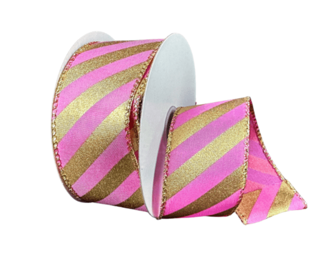 A roll of dark pink satin ribbon with metallic gold diagonal stripes. Use for Christmas Candy themed projects, bows, and accents.