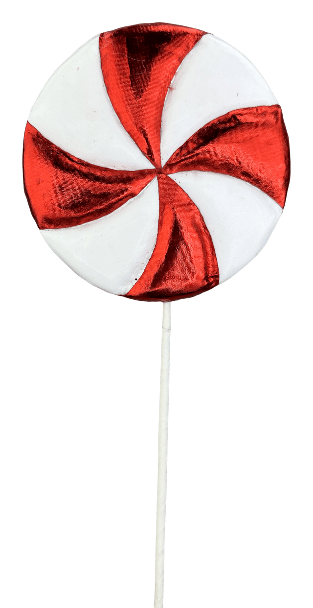 15" Red and white peppermint lollipop on pick. Candy piece is about 5" across. Fun addition to whimsical candy themed Christmas wreaths, trees, centerpieces, florals, etc.