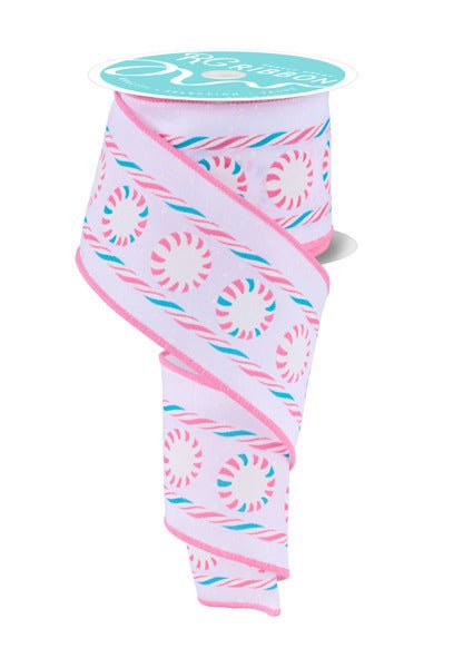 A 2.5 inch x 10yd roll of white satin ribbon with pink and ice blue peppermint candies. This ribbon would be perfect for fun Christmas Candy themed bows and accents!