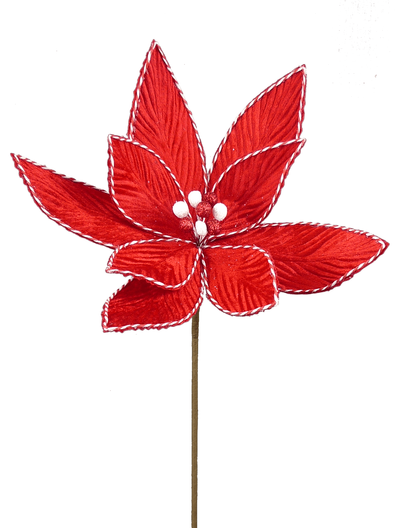 24" red poinsettia bloom with red/white twisted thread edges. Add them to your or Christmas themed trees, wreaths, garland, floral arrangements, etc. Great for peppermint themed decor!