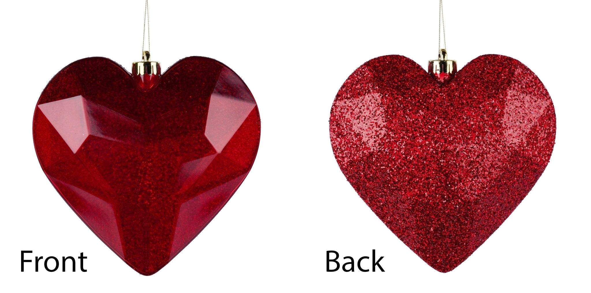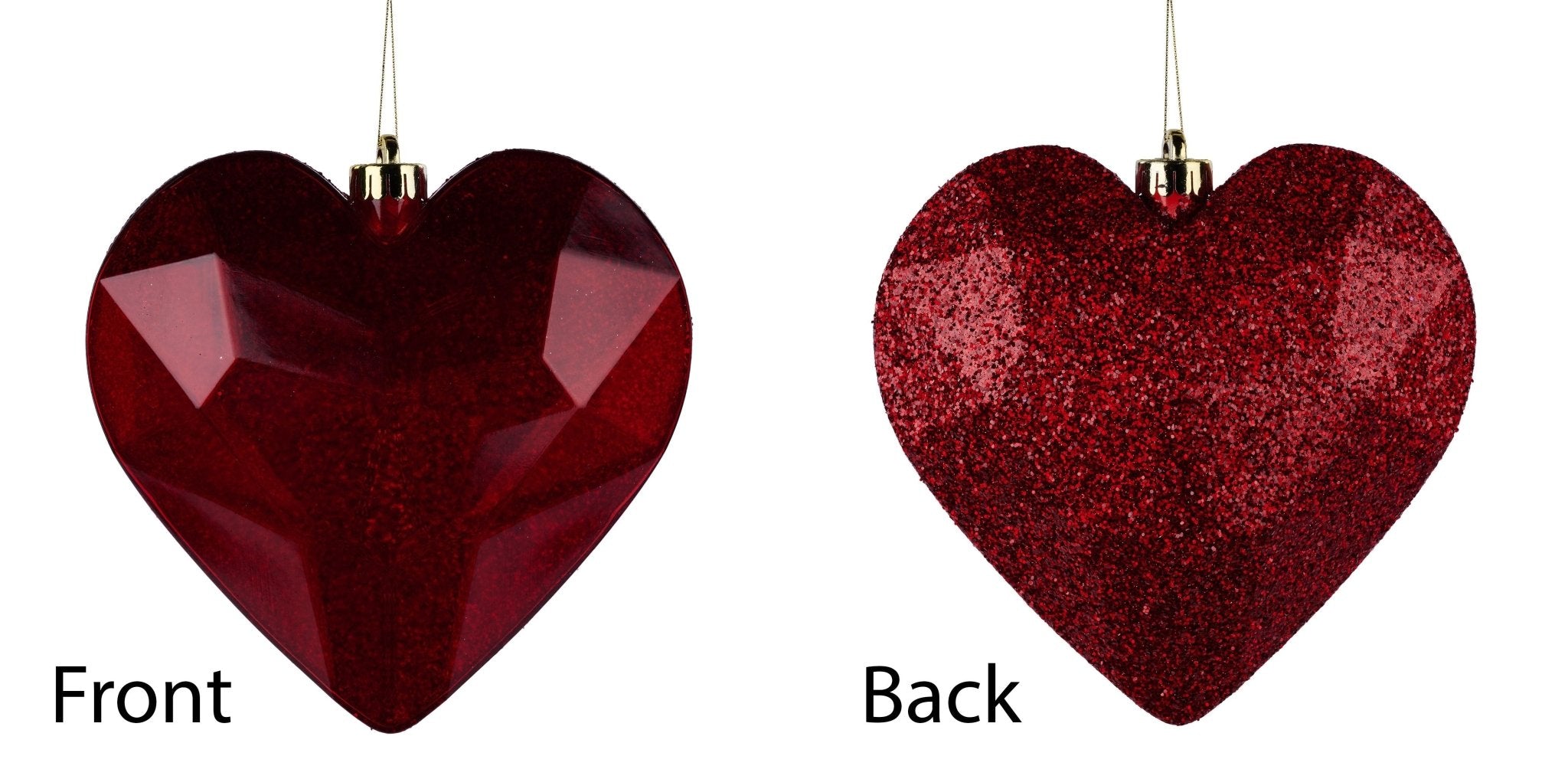 7.25" Red colored heart shaped laser glitter gem ornament with glitter back. Get that WOW factor from your tree or wreath with these over the top shatterproof precious gem ornaments!
