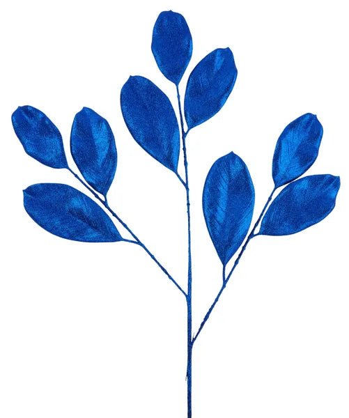 20" Decorative Magnolia Leaf Spray in glittery royal blue. Add to your winter or Christmas Wreaths, swags, trees, centerpieces, etc.