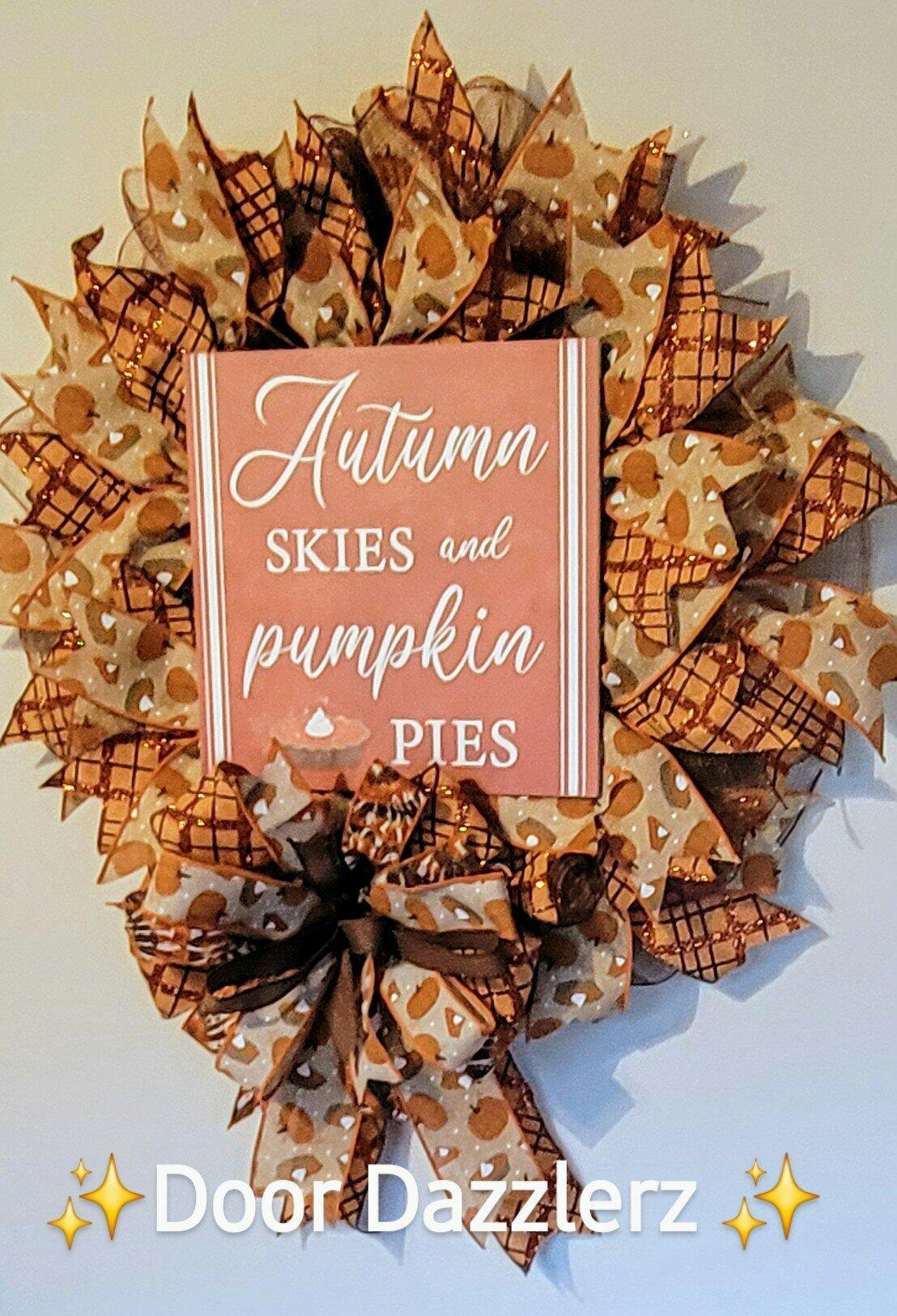 10" Square Autumn Skies and Pumpkin Pies sign. This sign is made of mdf with adhesive sticker. Fun addition to your Fall wreaths, or add a coordinating bow and hang! Pair with coordinating pumpkin pie ribbon!
