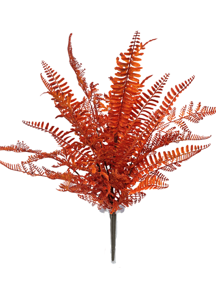 19" Plastic Mixed Fern Spray in Orange. Great filler for your Fall wreaths or floral pieces! Use the entire bush, or cut off stems to use separately.