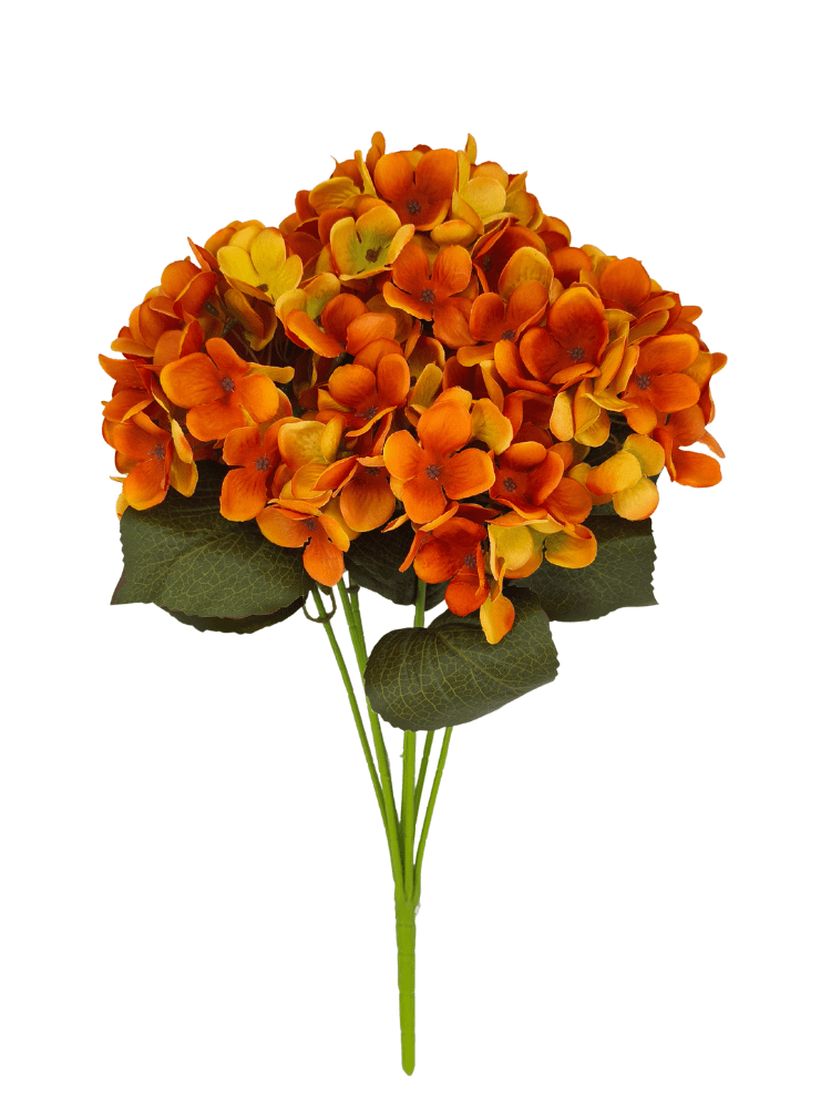 20" hydrangea bush with 7 orange colored blooms with touches of yellow and green. The leaves are a dark green and flower petals are delicate. These blooms would make beautiful additions to your fall wreaths and florals!