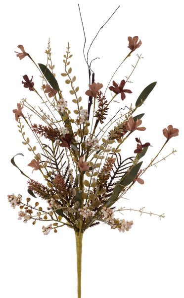 24" spray with small brown and beige flowers, eva foam leaves, and small cream colored beads. Mix into your wreaths and florals to add a touch of color. Use the entire bush, or cut off stems to use separately.