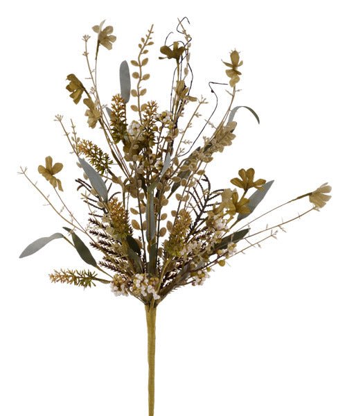 24" spray with small moss green colored flowers, eva foam green leaves, and small cream colored beads. Mix into your wreaths and florals to add a touch of color. Use the entire bush, or cut off stems to use separately.