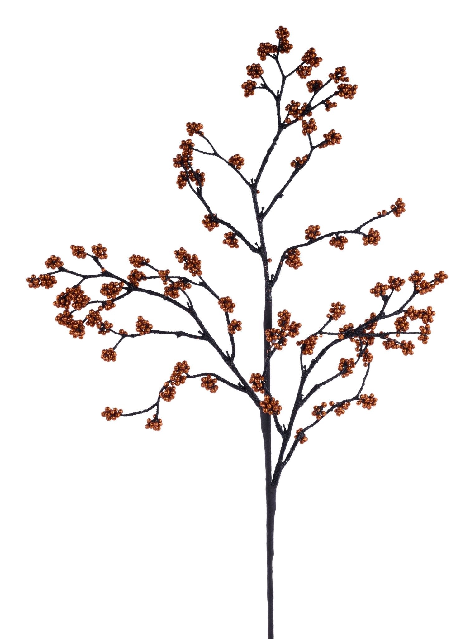 26" Glitter Twig Mini Bead Spray with black glittery twigs and orange mini beads. Nice accent for your Halloween wreaths, trees, centerpieces, etc.
