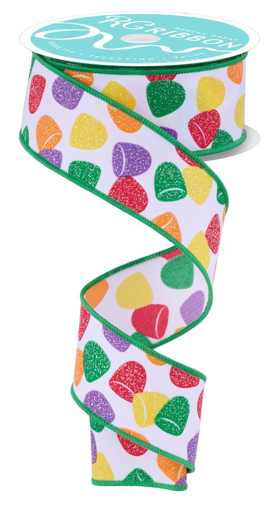 A 1.5 inch x 10yd roll of white ribbon with glittered red, green, purple, yellow, and orange gumdrops and an emerald green edge. This ribbon would be perfect for fun Christmas Candy themed bows and accents! Wired