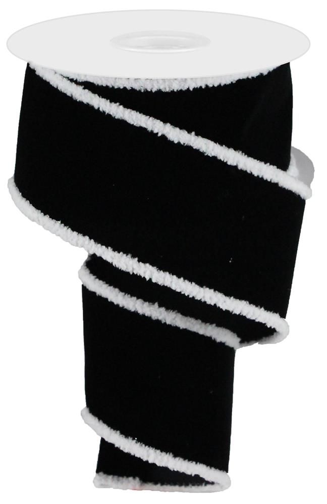 A 10 yard roll of 2.5" wired black velvet ribbon with white snowdrift edge. This ribbon has lots of possibilities for Christmas accents! It would really be cute with a Santa theme! The wired edges make this ribbon perfect for shaping into bows.