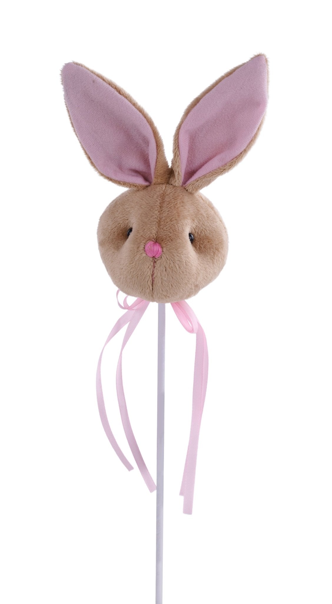 Sweet tan plush bunny head on a pick with pink ears and bow. Head is about 7.5" tall (including ears) on a 12.5" pick making it perfect for adding to your Easter Wreaths and trees!
