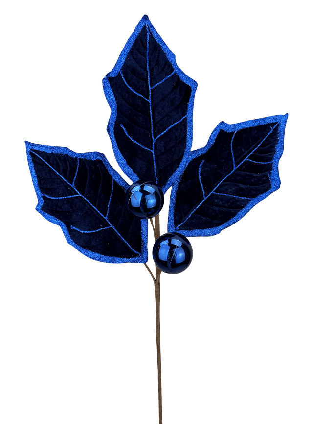 30" Holly Leaves Pick with dark blue leaves and blue glittered edges.  Add to your winter and  Christmas trees and decor.