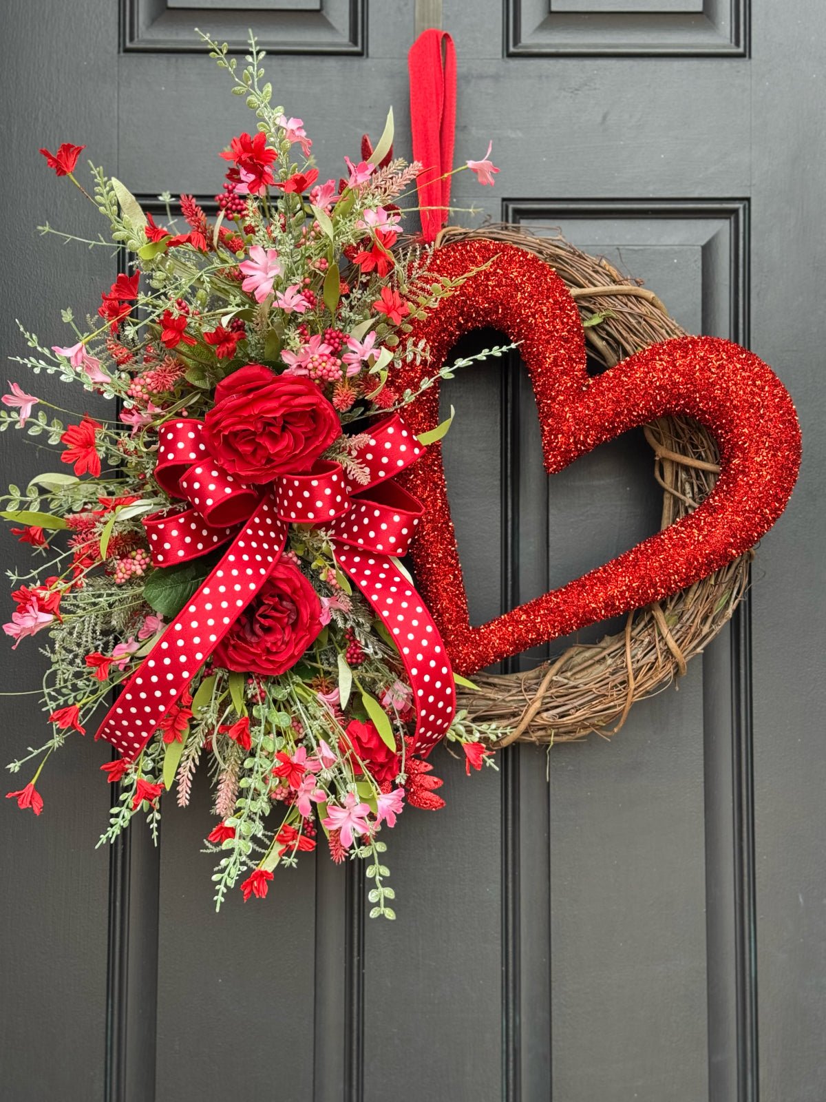 Celebrate Valentine's Day and spread the love with this Floral Grapevine Open Heart Wreath. It features a large glitter open heart, a polka dot bow, and pink and red floral sprays. This wreath is made on an 18" grapevine wreath base and is roughly about 26" across and 28" long. Price includes shipping cost.