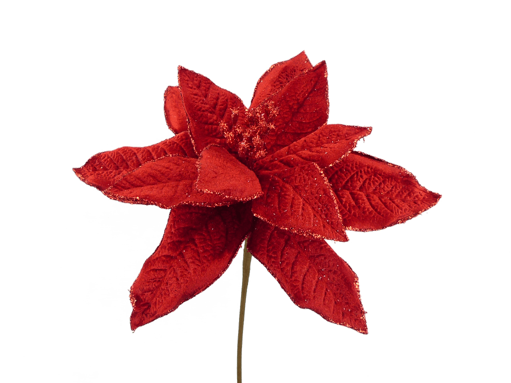 Red velvet poinsettia bloom with glittered edges measures approx. 11" diameter on 13" stem. These picks would make beautiful Christmas accents! Add them to your Christmas tree, wreaths, garland, floral arrangements, etc.