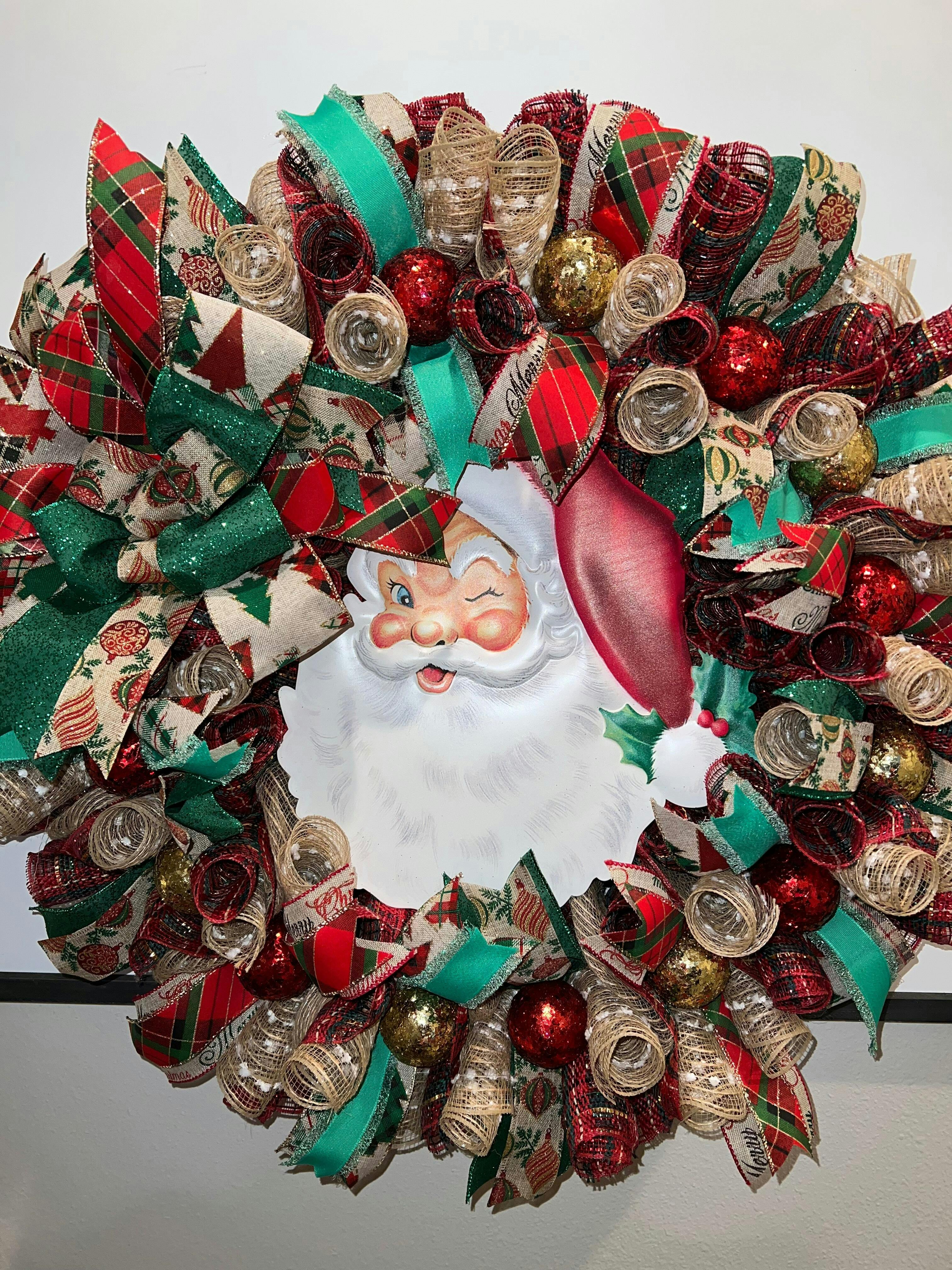 12" embossed metal Santa face with rosy cheeks holly on his hat. Made of heavy duty metal with attached sawtooth picture hanger on the back. Cute addition to you Christmas wreath or decor! Measures 12" x 11.75".