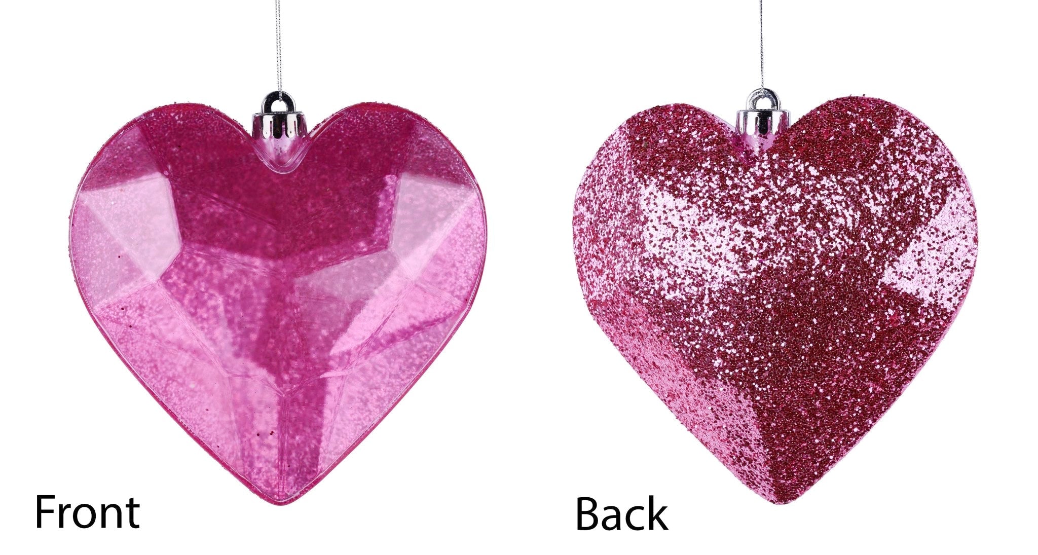 7.25" Pink colored heart shaped laser glitter gem ornament with glitter back.. Get that WOW factor from your tree or wreath with these over the top shatterproof precious gem ornaments!