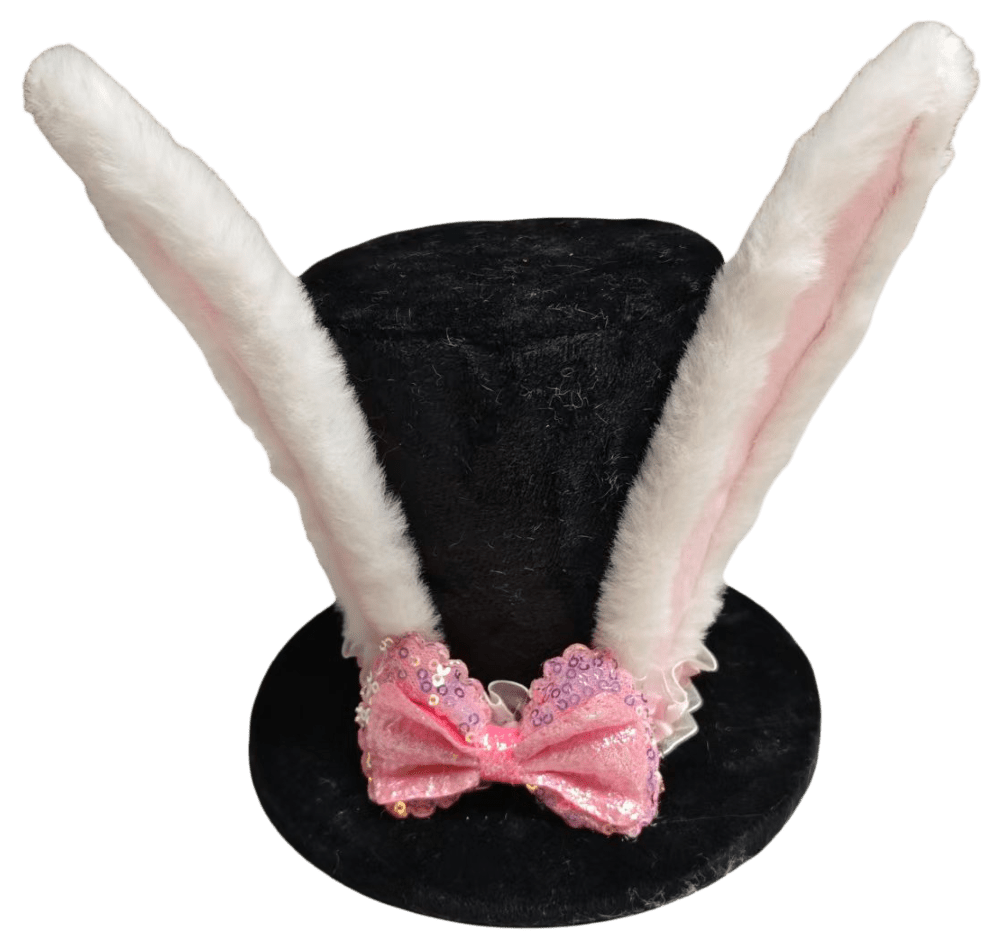 Black Velvet top hat with pink and white bunny ears, sheer pink and white band, and pink sequin bow. Measures 8" tall (to tips of ears) by 6.5" across brim. Bunny ears are wired. Made of cardboard and fabric.