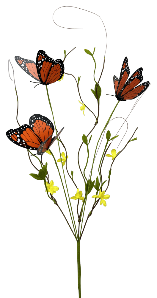 Delicate Orange and black butterfly spray with three butterflies and small yellow flowers with green leaves. Great accent for spring wreaths and floral arrangements!