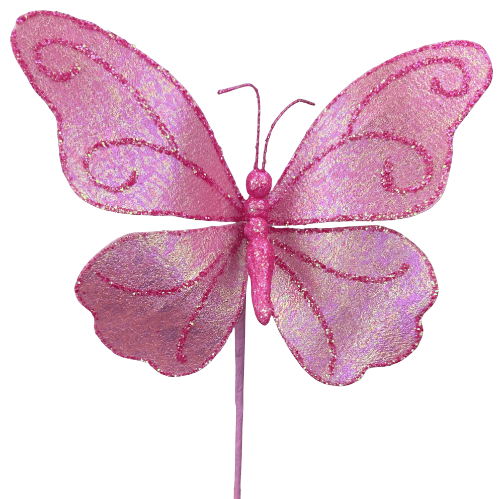 Pink Felt Butterfly Pick with glittery body and outline. Fun accent for spring wreaths and floral arrangements! Pick is 9" high and 9" wide (when fully extended).