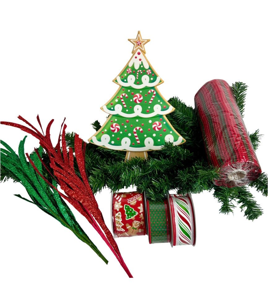 Make your own fun Christmas Swag with this Candy Christmas Swag kit! Includes teardrop base, 1 roll of 10" mesh, metal Christmas tree, 3 ribbons, and one each of the red, green and white sprays.