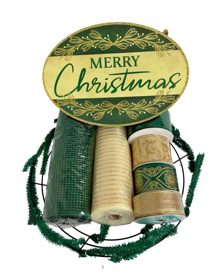 Make an Elegant Deco Mesh Christmas Wreath with this Green and Gold Merry Christmas Wreath Kit. You will receive everything you need to make a stunning Christmas wreath in these elegant colors! Includes 2 rolls of 10" mesh, wreath form, wood sign, and 4 ribbons.