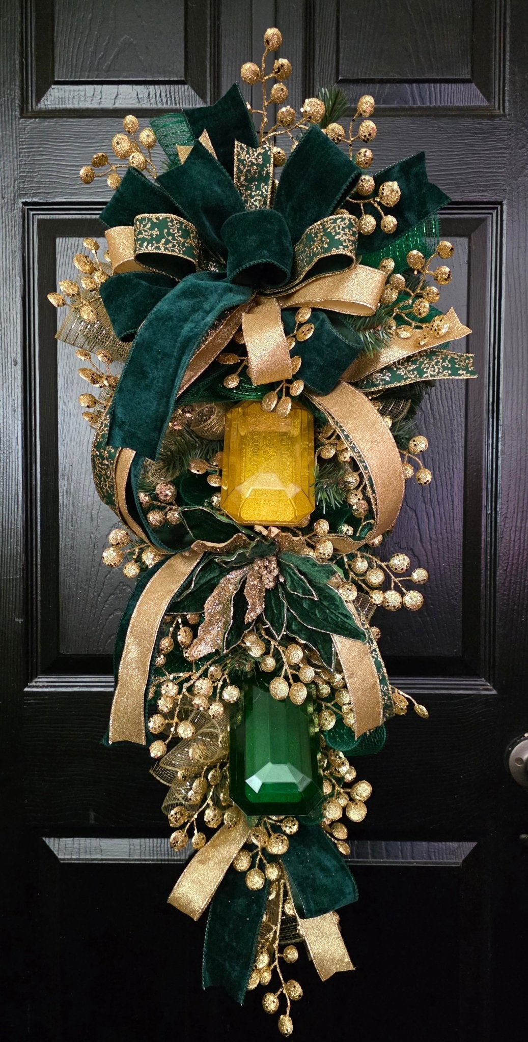 Make your own elegant Christmas swag in hunter green and gold, glimmering with jewels. Find all of the products to make your own HERE. Example only.