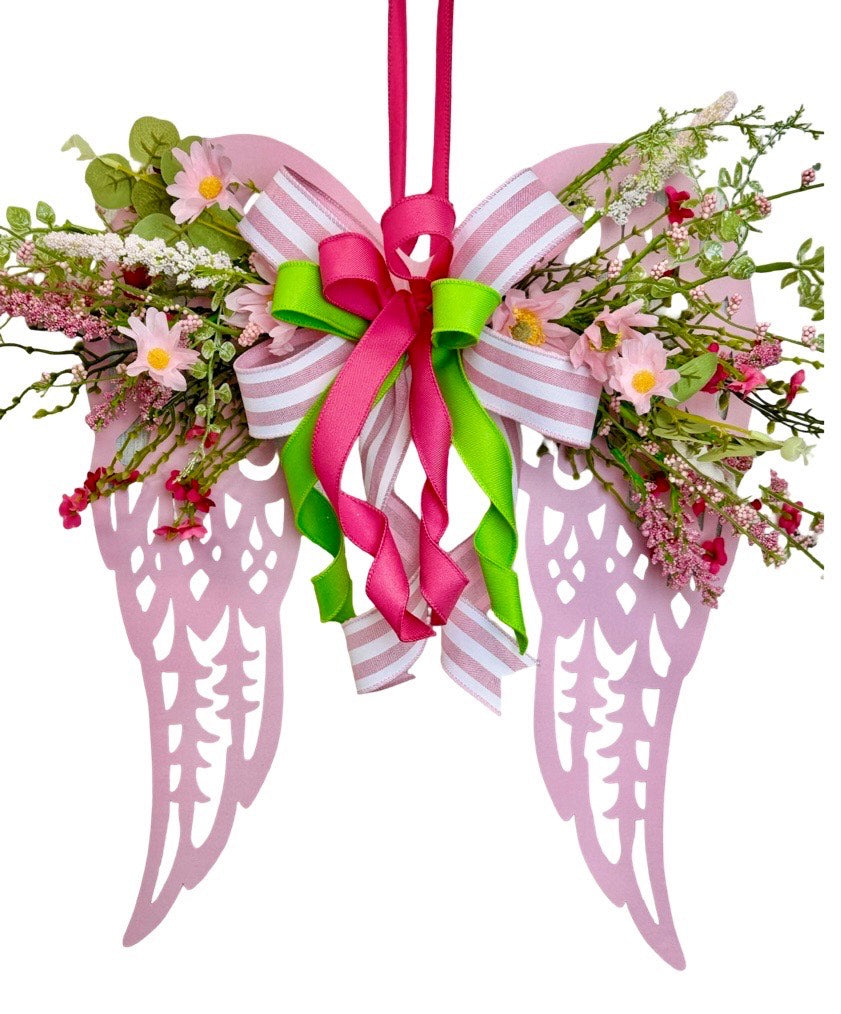 Metal Pink Filagree Angel Wings decorated with a bow and florals.  Beautiful piece. Has an attached bow for hanging. 14.75" wide x 17.72" high