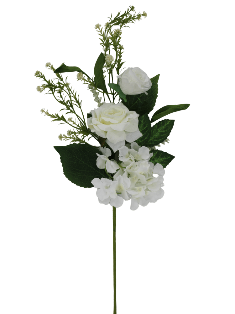 19" rose and hydrangea spray with white blooms and green leaves. These blooms would make beautiful additions to your spring and summer wreaths and florals!