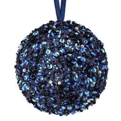 Midnight Blue 4" sequin ball ornament, covered in deep blue sequins, beads, and glitter. Add these ornaments along with dark blue poinsettias and luxurious ribbon to your Christmas trees, wreaths, garland, etc. for sparkly glam!