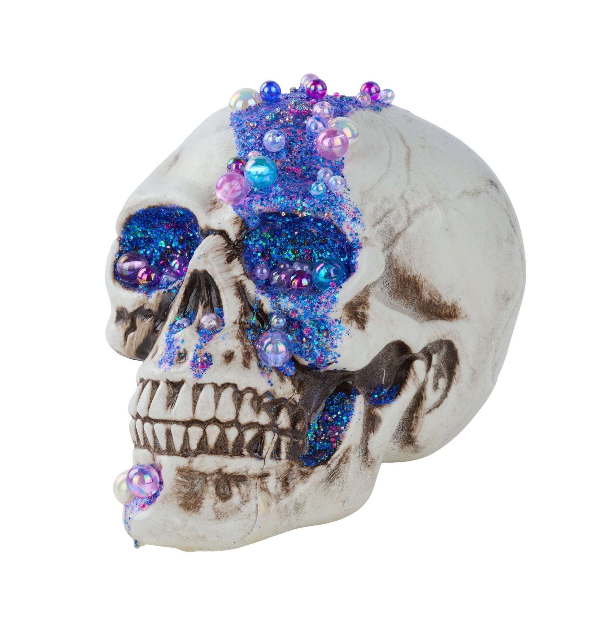8" Creepy Antique White Skull accented with iridescent beads and glitter. Fun Halloween decor to add to your wreaths or home.
