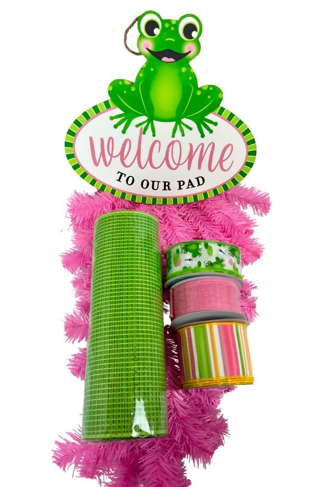 Make this fun Welcome Frog Swag with this swag kit. Pink and green are always fun and happy colors so welcome your guests with this happy frog swag! Includes 1 roll of 10" mesh, pink swag, sign, and 3 ribbons. (Example of finished wreath is slightly different, as it has one ribbon replaced.)
