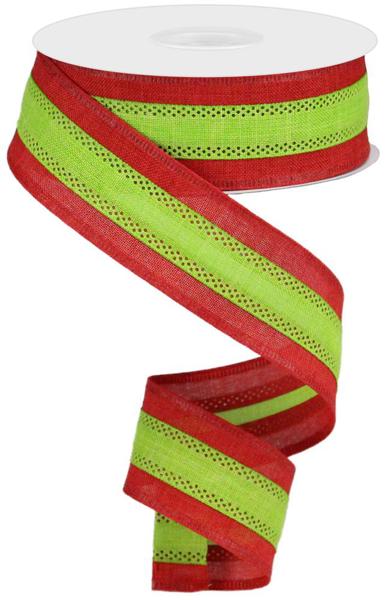 A roll of tri-stripe linen type ribbon with red stripes on the outsides and a lime green stripe running down the center. Wired, 1.5" x 10yds. Great for Christmas! The wired edges make this ribbon perfect for shaping into bows. 100% polyester.