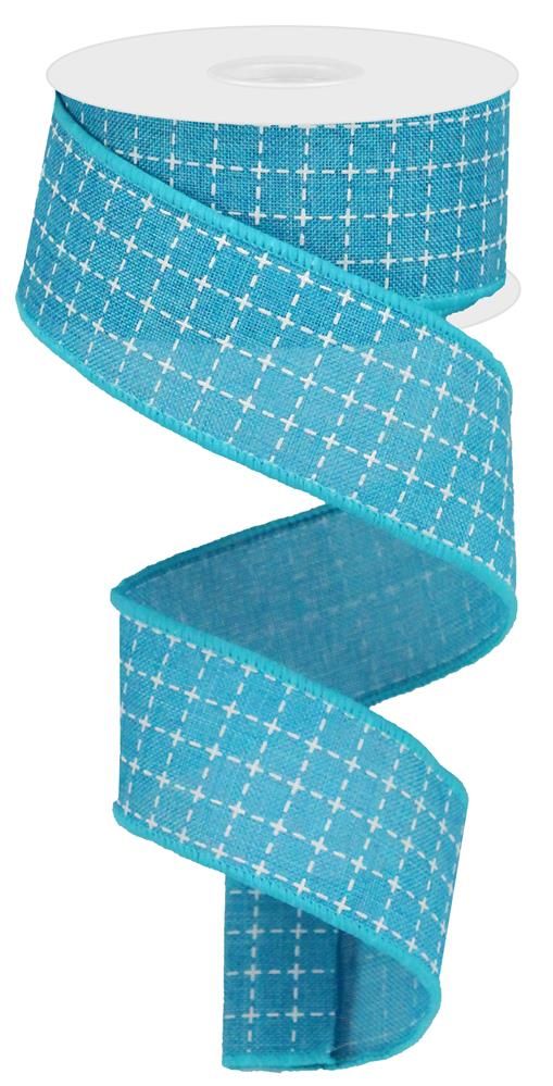A 1.5" x 10yd roll of wired turquoise check/square ribbon with white stitching. Great spring and summer accent! Use to make wreaths, bows, or for gift wrapping! The wired edge makes this ribbon perfect for making bows.