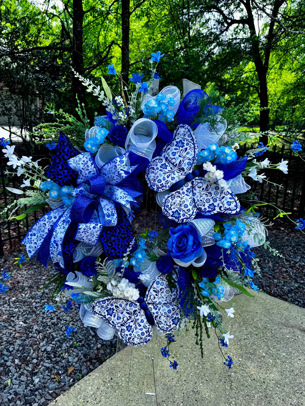 12" Metal Butterfly sign with a blue and white chinoiserie print. Pair with our chinoiserie ribbons on a spring wreath!