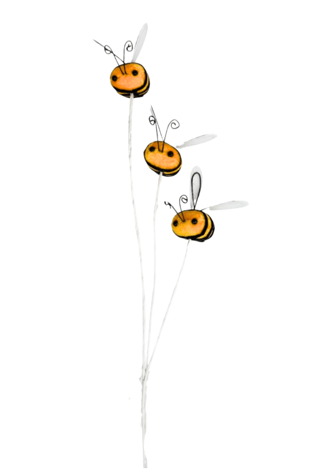 Adorable Bumble bee pick with 3 bees with felt yellow bodies and black stripes with white wings. Each bee is about 2" long. Fun accent for bumble bee wreaths and floral arrangements!