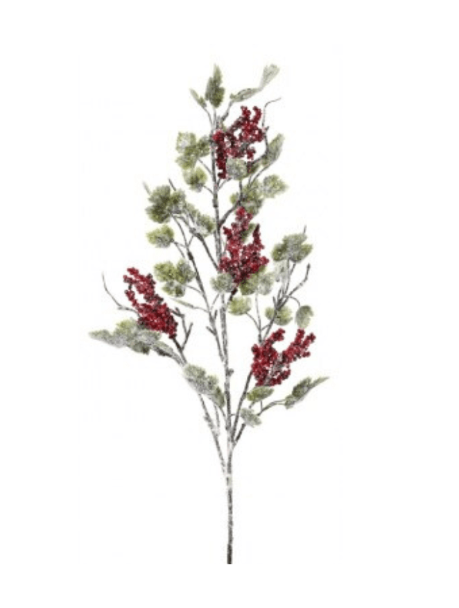 36" Frosted mini grape leaves and red berries spray. Great accent for Christmas trees, decor and florals, etc.