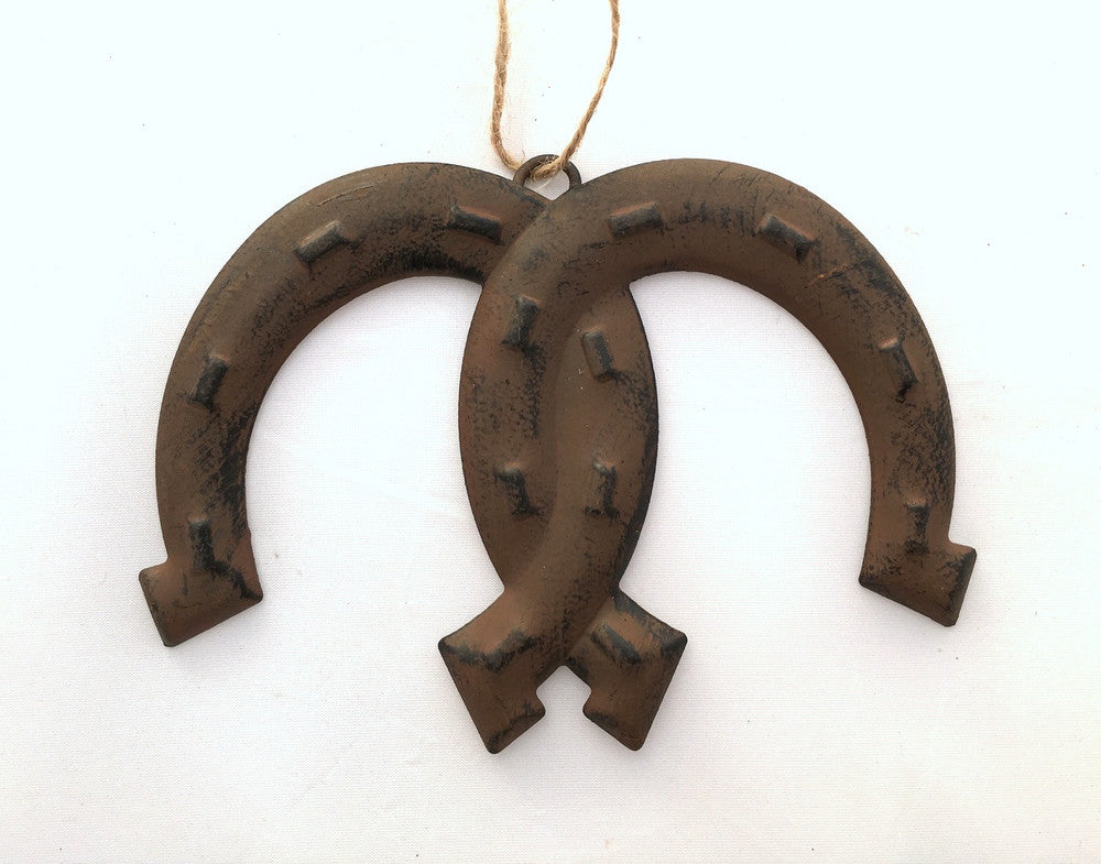 Brown Rustic Tin Horseshoe ornament with jute string hanger. One-sided. Cute for western themed Christmas decor accents! Measure 6" x 4"