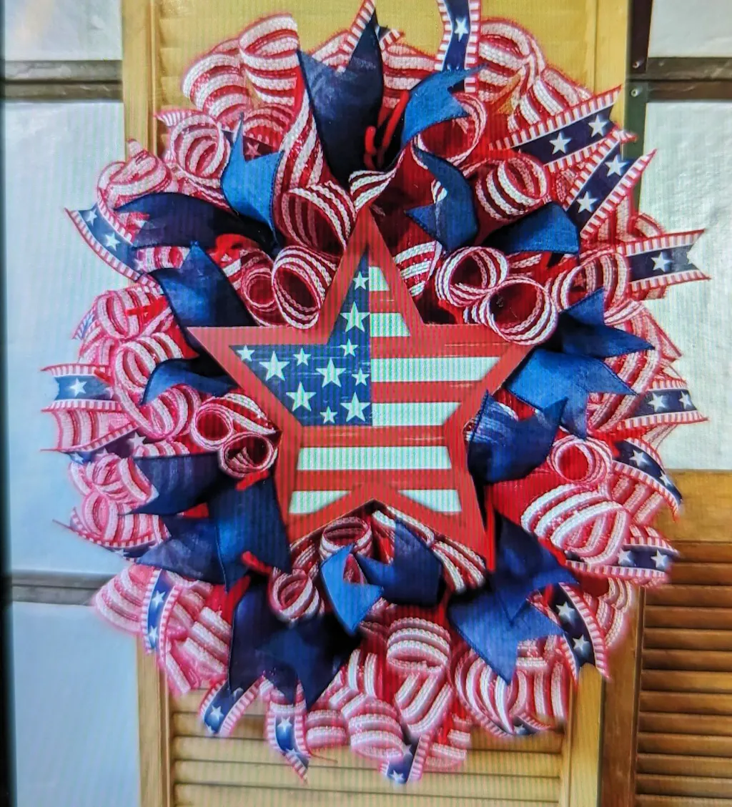 Large, 50yd roll of linen type patriotic ribbon with a navy blue strip down the center with white stars and red and white stripe edges. Red wired edges. 1.5" x 50YDs. Great deal for patriotic accents!